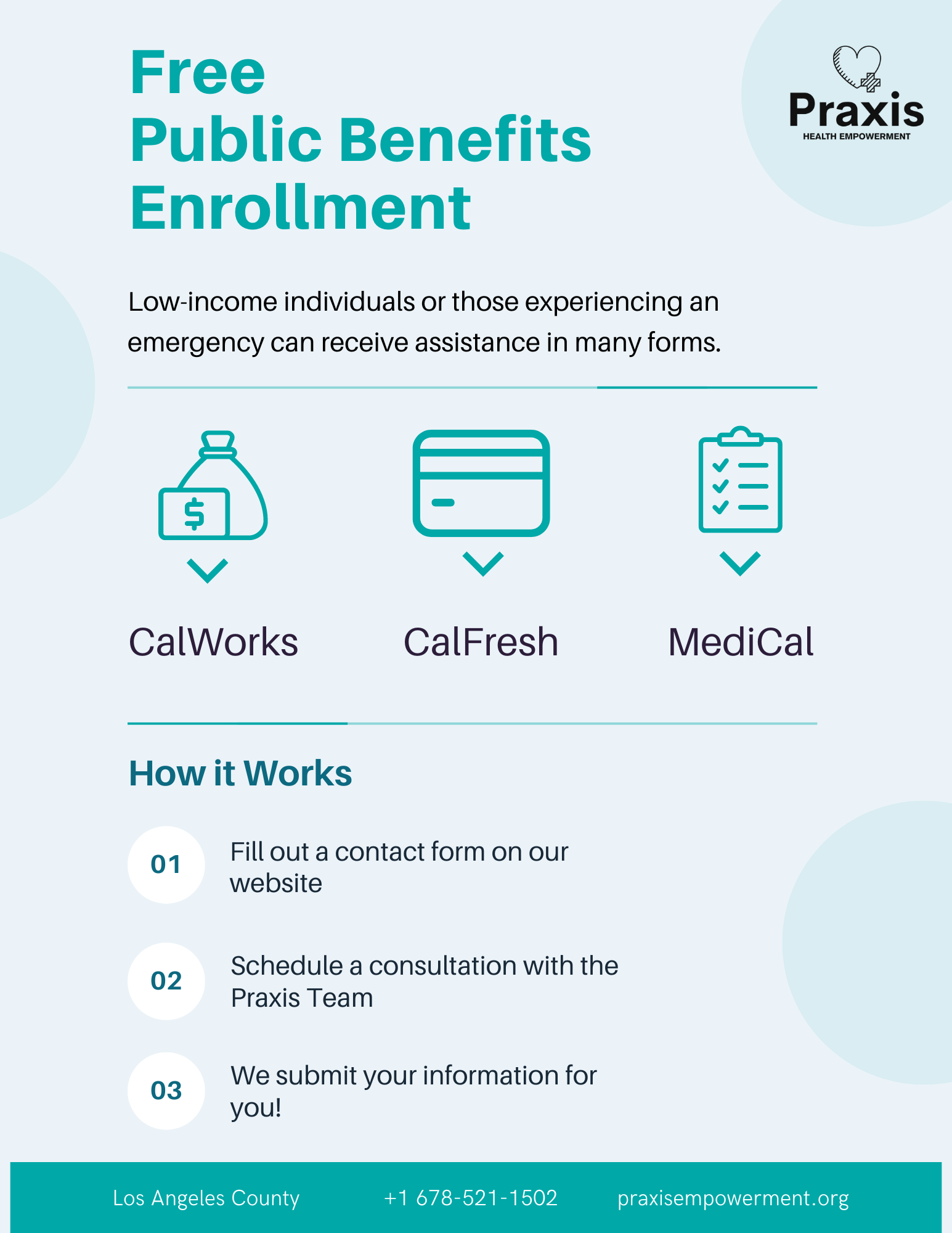 We provide Health Insurance Enrollment Counselling for Covered California and MediCal, and we assist in helping individuals acquire Public Benefits (CalFresh, CalWORKS, etc).